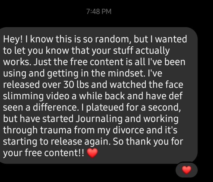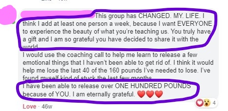 "In 9 months, I have released 30 pounds! More importantly I have learned that I don't need to eat unless I'm actually hungry & that I can eat whatever my body decides it wants. I have had many non scale victories which is extremely important to be aware of. Last night, my 12 year old son hugged me & lingered for a bit ( in shock I think) & then told me how much smaller I felt! Also, I've been as blessed to move in ways that I don't recall having moved before. Certain parts of my body especially legs & arms feel & look smaller, which is so wonderful because they've been so big for so long. Thank you again, Aimee for helping me love myself & learn to get myself back & not hide as much anymore. After watching your first video talking about thanking my body & my fat for being there for me & letting it know that I was safe to release it, was such a pivotal moment for me. I did what you suggested & surprisingly I felt lighter the next few days..I believe I instantly started releasing weight from that moment on. I was shocked & really began understanding how important positive self talk truly was."