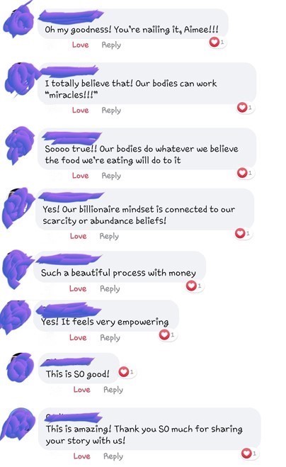 "AIMEE! That detailed conversation you walk us through with our body and with money was amazing!!! I was bawling and felt the weight lift off my body. I am filled with so much hope now for my body and my relationship with money! It felt great having those conversations and I loved that you went through them so I knew what to say as I have never done this before! Thank you thank you!"